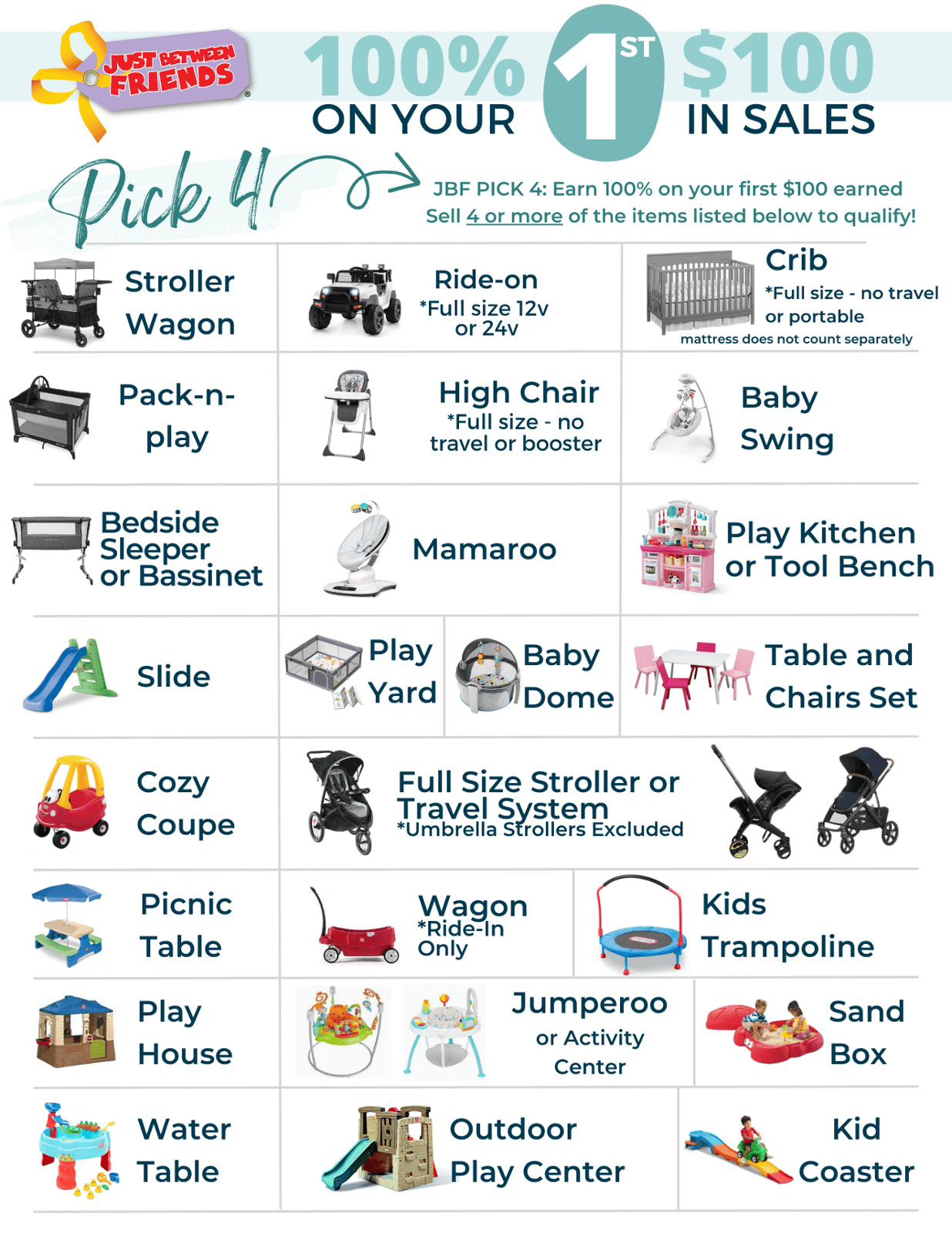 Umbrella stroller, Frame-only stroller, booster car seats, booster high chairs, clip on high chairs, portable high chair, doorway jumpers/swings, items that are not full size.To get the bonus, ask for the 100% Bonus Form when you drop off at least 4 qualifying items.