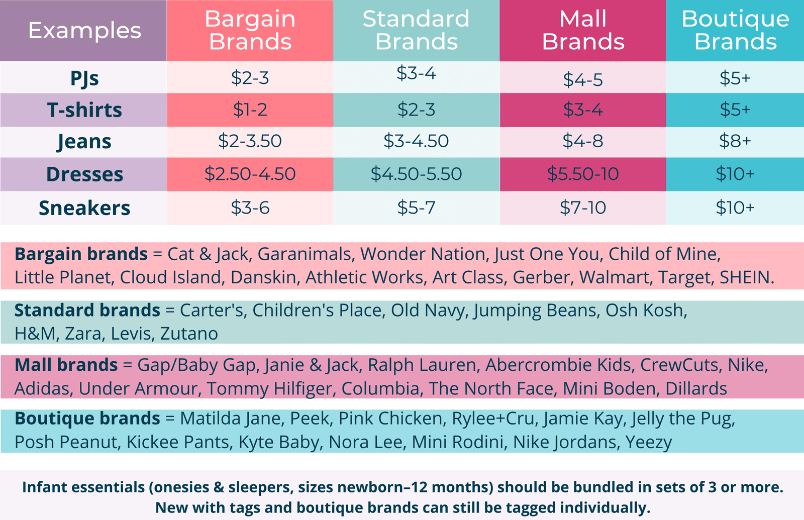 ✅ Price a little higher for items brand new with tags, boutique brands, and large baby equipment like strollers. Price a little lower for infant sizes, maternity, and bargain brands (think Garanimals, Jumping Beans, Cat & Jack, etc.)